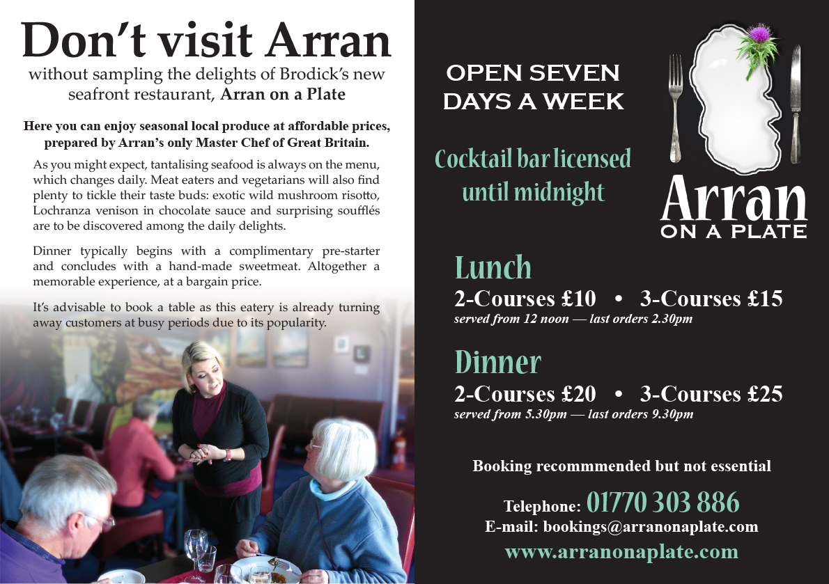 Opened in March 2010, Arran On A Plate is a family-run restaurant based on the waterfront of Brodick on the Isle of Arran.